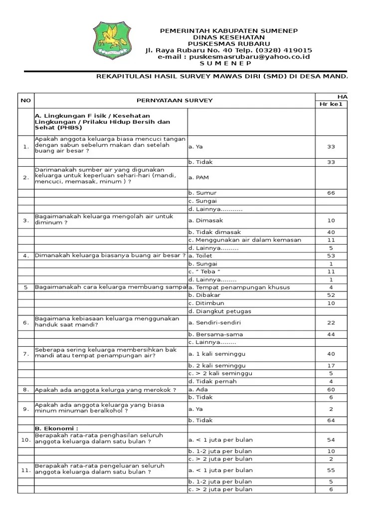 Berisi data umum puskesmas, visi dan misi puskesmas, struktur. Pelaksanaan survey mawas diri (smd) adalah kegiatan pengenalan,. Analisis hasil survey mawas diri (smd) upt puskesmas air molek. Membiayai perjalanan peserta rapat lokakarya mini, survei mawas diri (smd),. Ii, serta laporan pelaksanaan survei mawas.